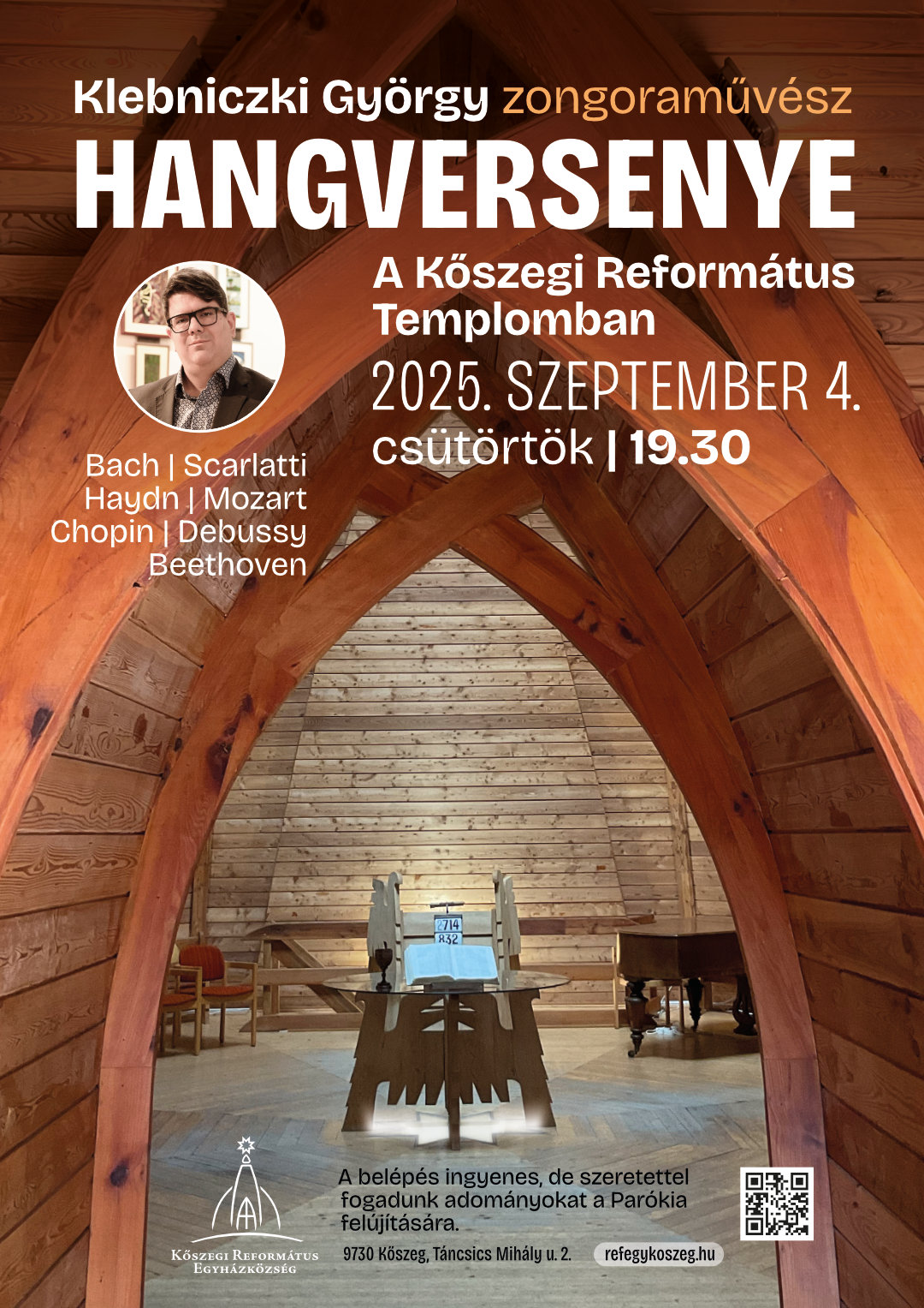 2025. szeptember 4-én csütörtökön, 19.30-tól templomunkban Klebniczki György zongoraművész, a Szegedi Tudományegyetem Bartók Béla Művészeti Kar adjunktusa koncertezik. Előadásában Bach, Scarlatti, Haydn, Mozart, Chopin, Debussy és Beethoven művei csendülnek fel templomunk kivételes akusztikájú terében.A belépés ingyenes, de szeretettel fogadunk adományokat a Parókia felújítására.A hangverseny itt hallgatható: