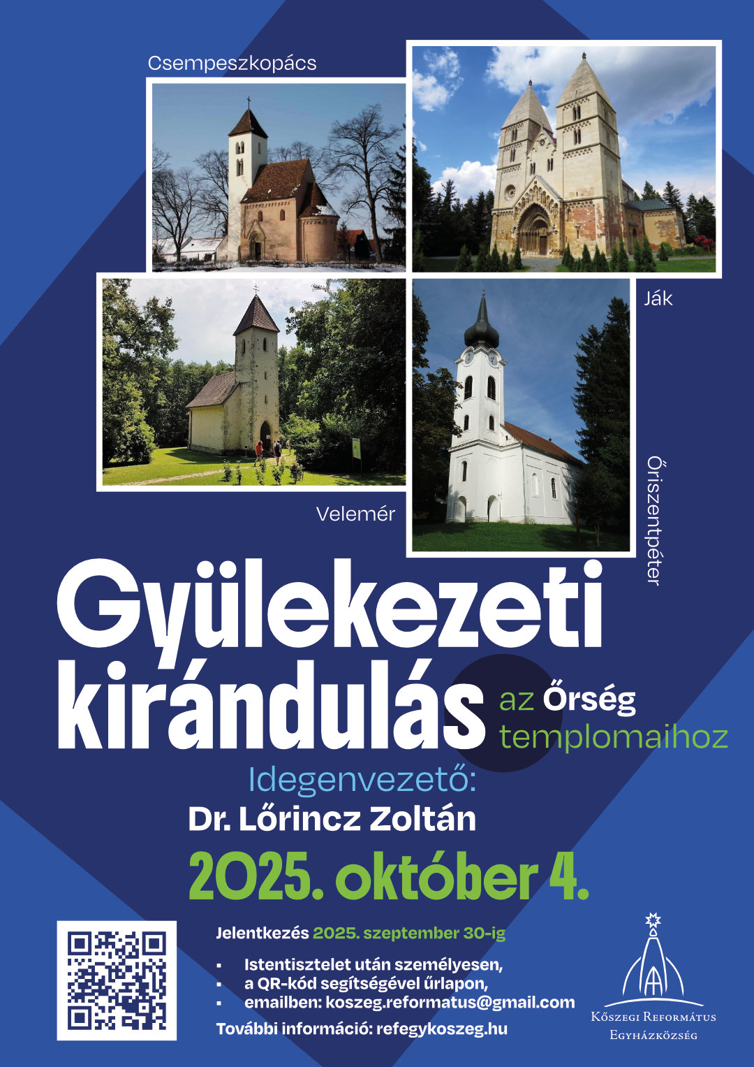 Fényképek!!!Gyülekezeti kirándulásunkon készült fényképek megtekinthetők itt!   2025. október 4-én az Őrségbe kirándulást szervezünk Dr. Lőrincz Zoltán művészettörténész vezetésével.Reggel 8.30-kor indulunk több autóval. Az Útvonal: 1. Csempeszkopácsi templom – Szent István hagyatéka > 2. Ják – Európa egyik legépebben megmarad román kori temploma > 3. Velemér– a gótika és ennek falusi változata > 4. Őriszentpéter – reformáció megjelenése a templomépítészetben.Ebédajánlatunk egy igazi vasi dödölle (helyi specialitás) az ottani étteremben.A késő délutánt szeretnénk […]