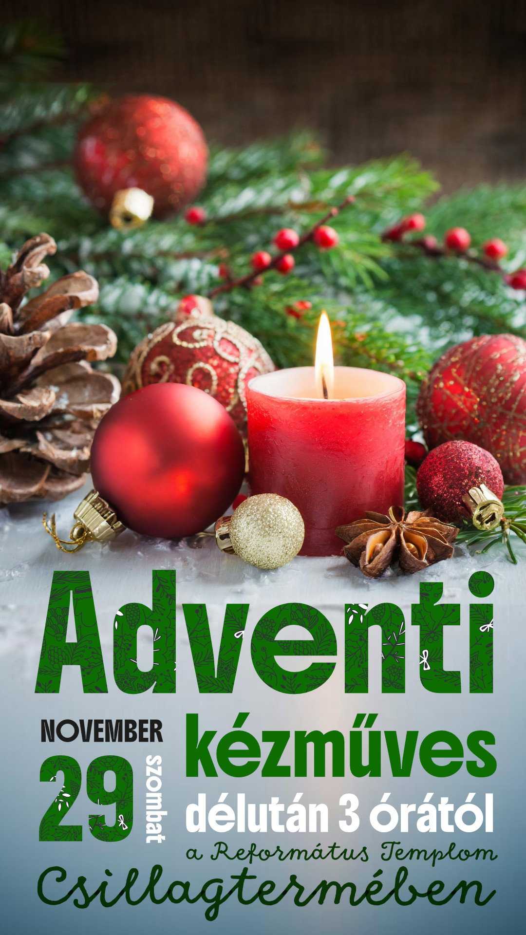 2025. december 6-án18.00 órától a Református Templom Csillagtermében Adventi dicsőítést tartunk. Várunk minden jóakaratú embert, aki szeretne bekapcsolódni Isten imádatába kortárs és régi dicséretekkel.Muresán Adriána – vokálKisantal Tibor – ének/gitárKádár Tamás – cajon és ritmushangszerek